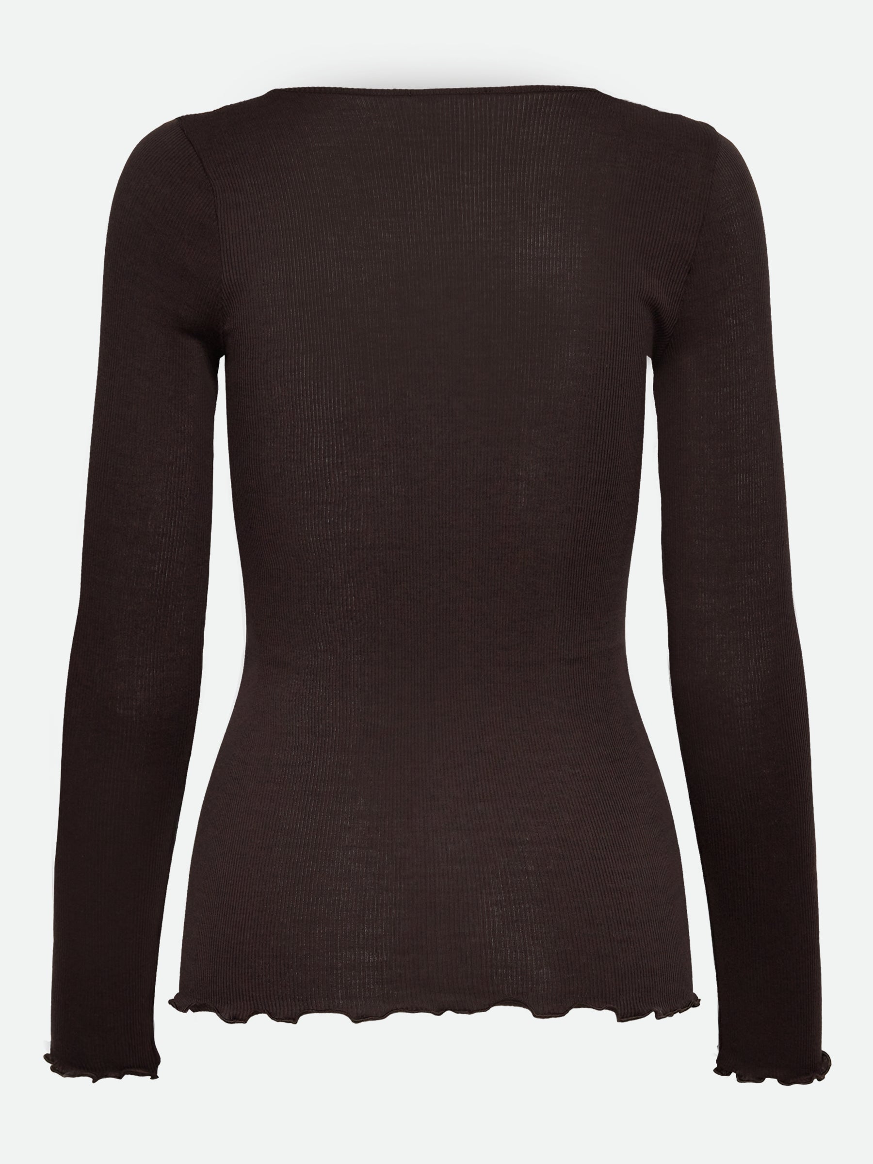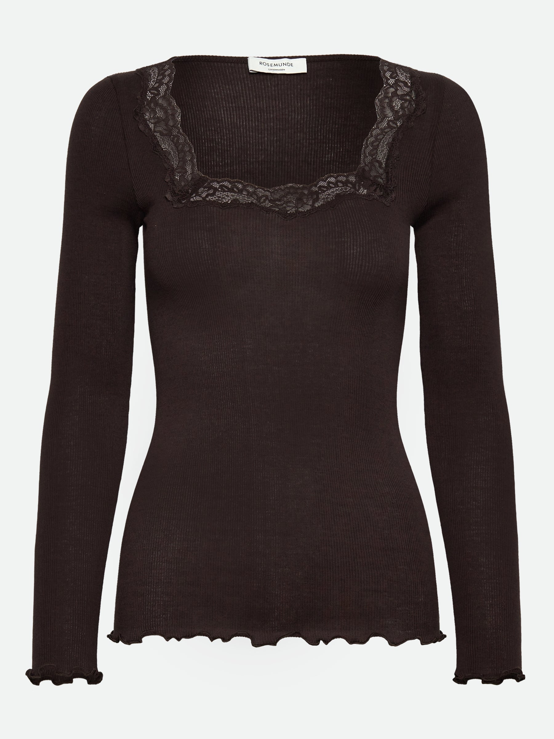 The Bernadine Organic Lace T-Shirt is where softness meets sophistication. Designed with a flattering fitted silhouette, this long-sleeved style features a romantic lace-trimmed neckline that adds effortless charm to everyday looks. The fine ribbed texture offers gentle stretch for all-day comfort, while the delicate lettuce-edge finish at the cuffs and hem elevates the piece with subtle detail.