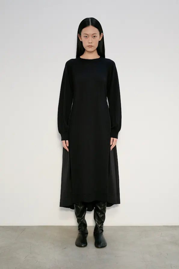 A distinctive piece that combines timeless style with a unique twist. The front is crafted from 100% wool, offering a luxurious, warm feel that’s perfect for colder days. The back is made from 100% polyester, adding a subtle contrast and enhancing the dress's durability and shape. With its long sleeves and flattering long fit, this dress is both versatile and chic, making it a standout choice for any occasion.