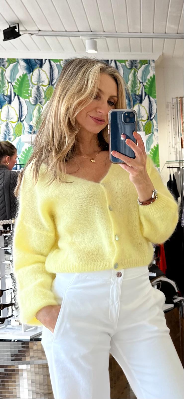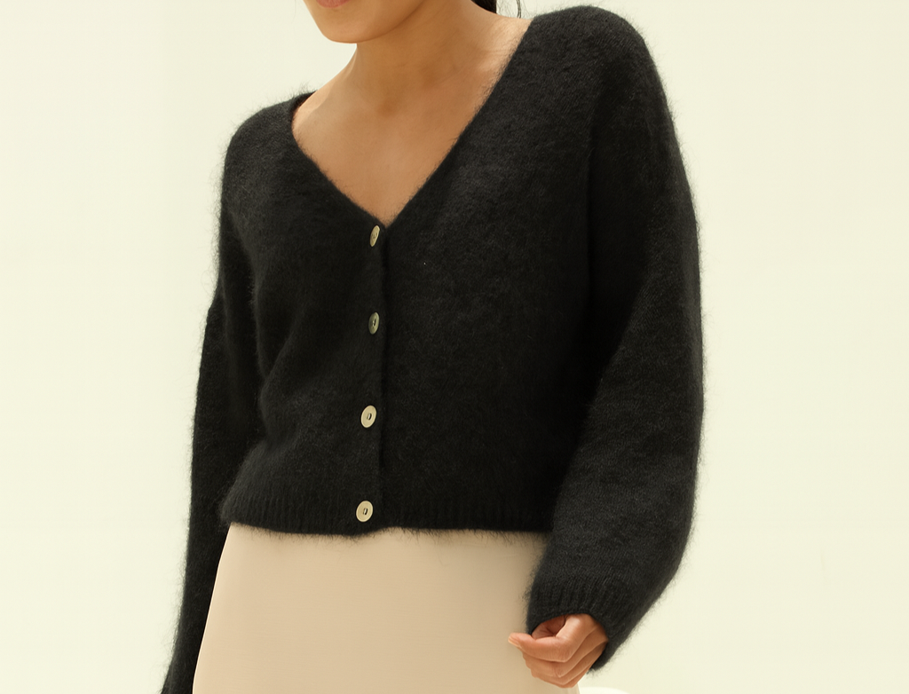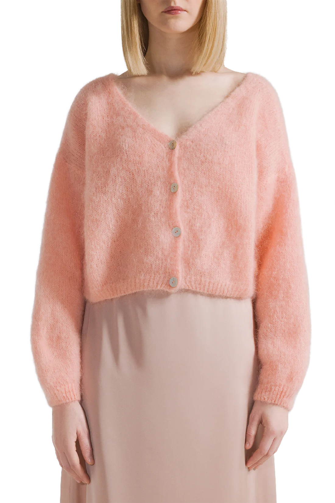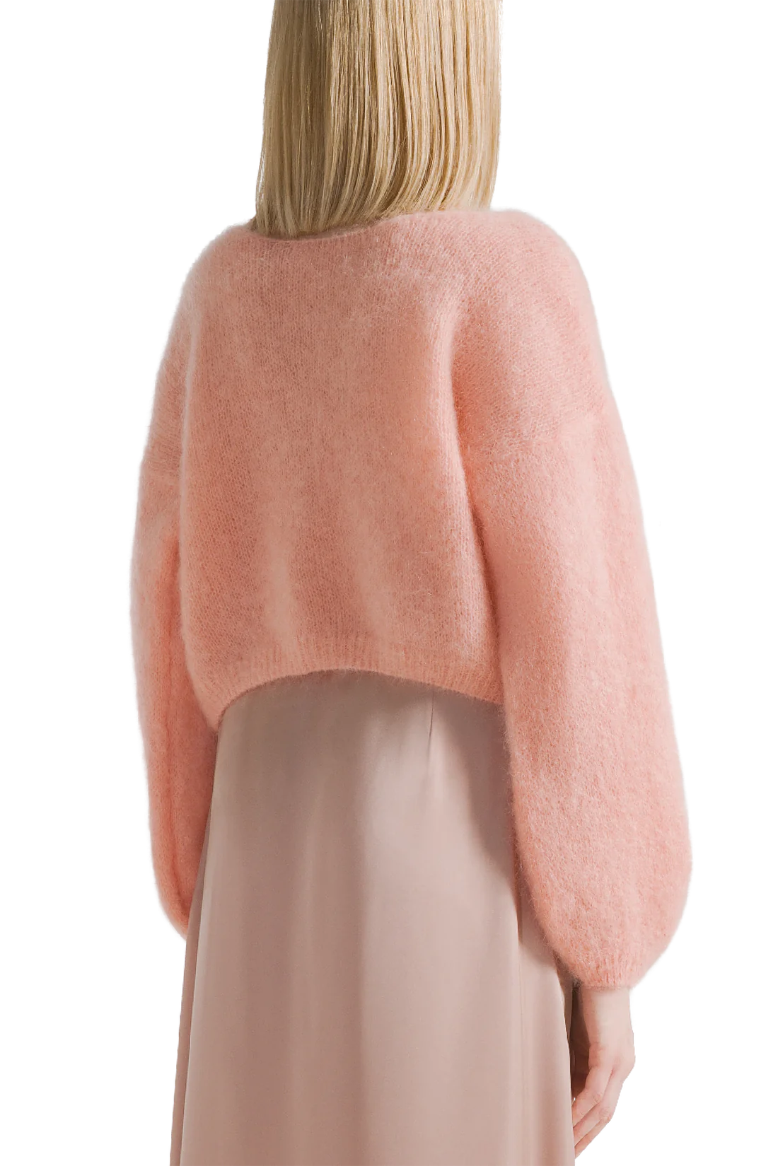 The Cornelia Cropped pullover draws inspiration from our Cornelia LS Cardigan, featuring the same fine, thin mohair knitwear material and button closure. Its cropped length creates an accent at the waist, while the oversized fit adds a trendy and voluminous silhouette.