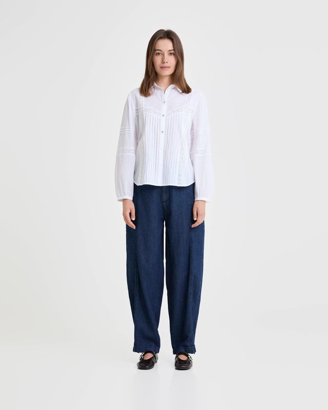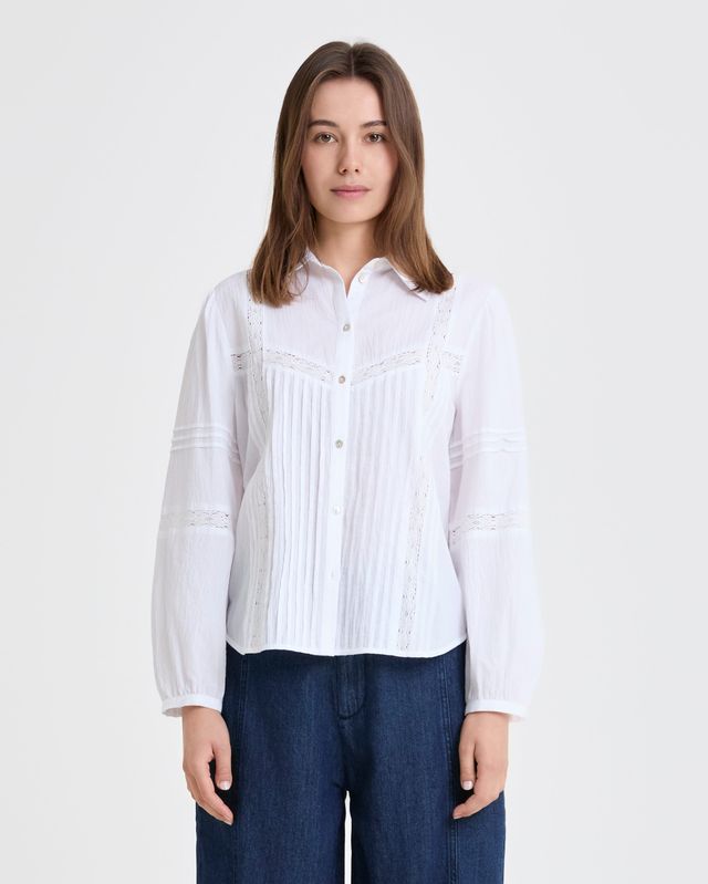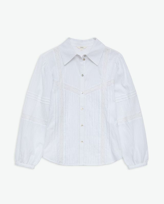 The Lace Trim Shirt by Yerse blends classic charm with everyday comfort. Made from soft, breathable cotton, this white button-down shirt features delicate lace trim and pintuck detailing for a refined, feminine touch. The structured collar and gently puffed sleeves add subtle volume, while the relaxed fit makes it easy to style for both casual and dressier looks. Pair it with wide-leg jeans or a skirt for effortless elegance.