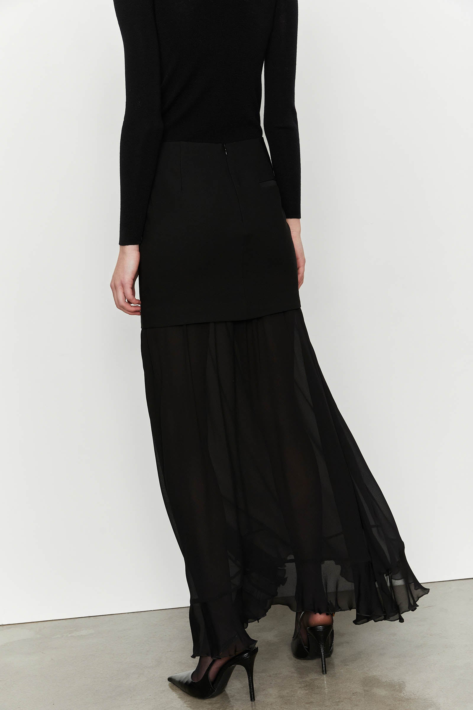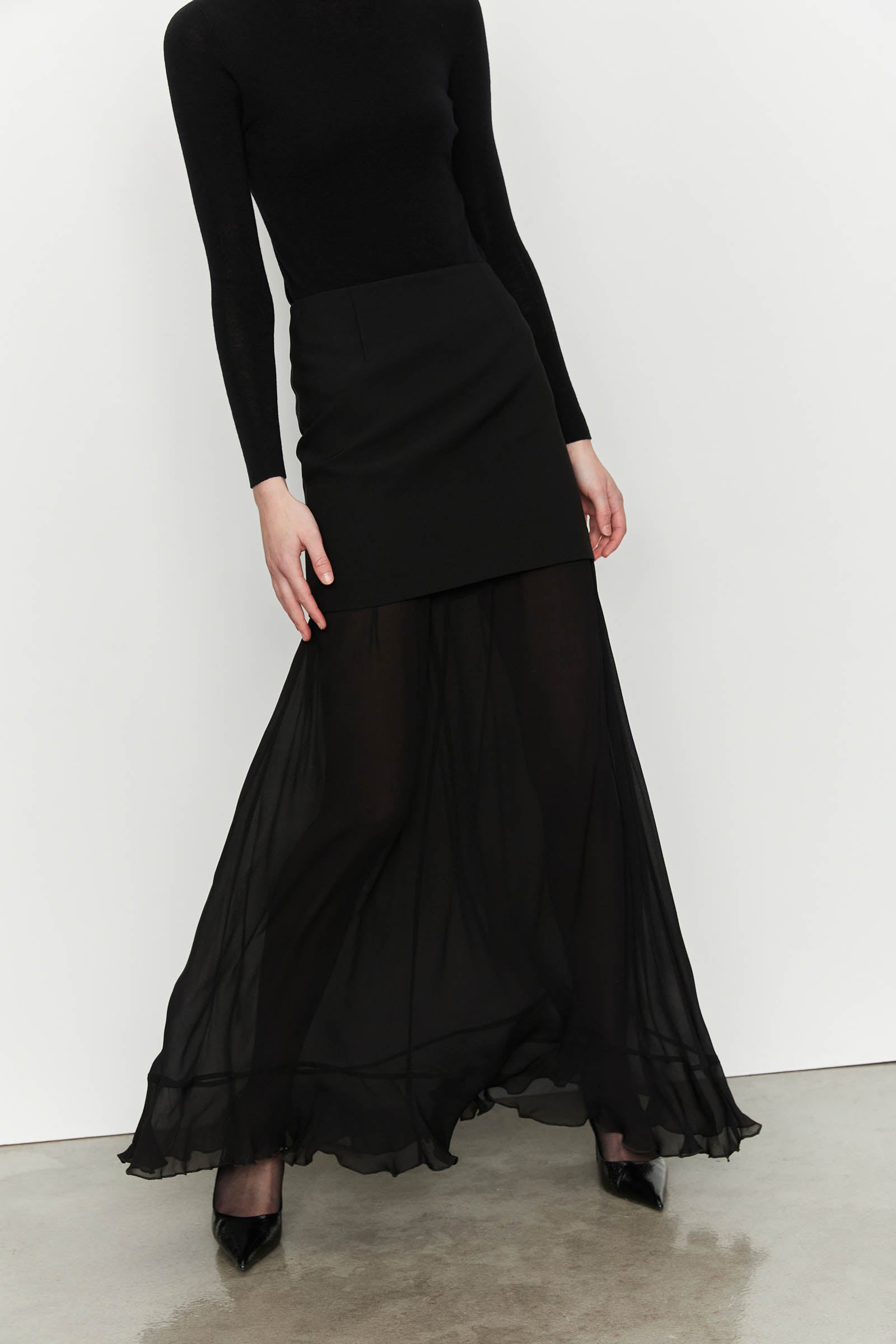 Elegant and fluid, the Crepe Skirt with Georgette Underskirt is a versatile wardrobe essential designed with graceful movement in mind. This piece features a soft crepe outer layer and a flowing viscose georgette underskirt that adds subtle depth and dimension. The layered effect creates a delicate silhouette that moves effortlessly with every step, while the tailored waistband ensures a comfortable, flattering fit.