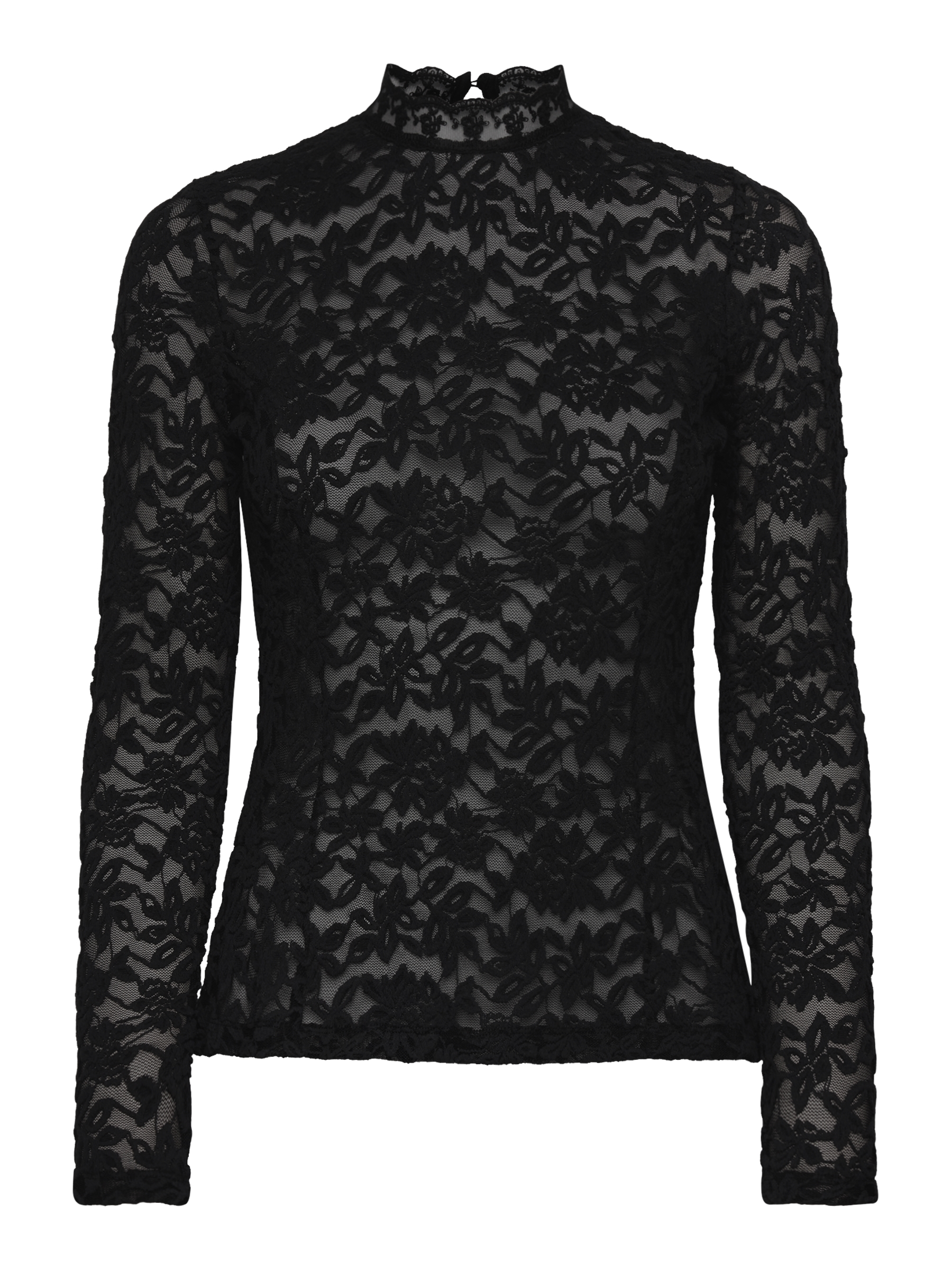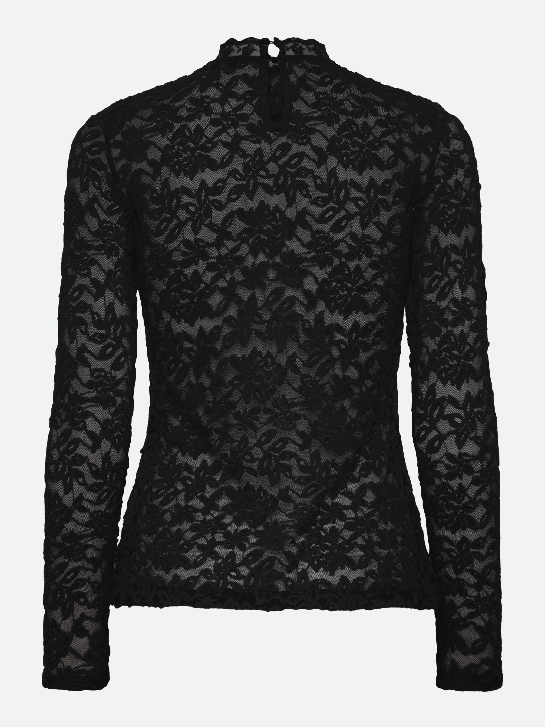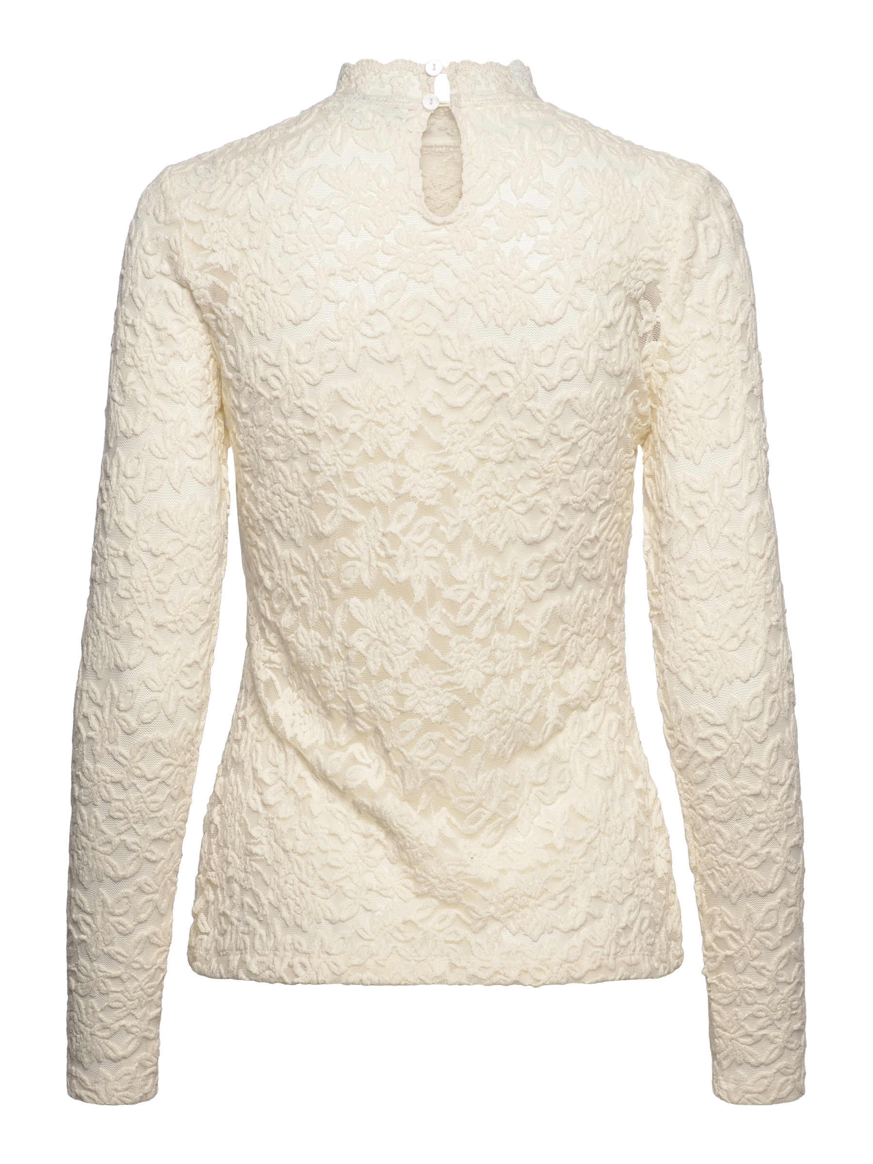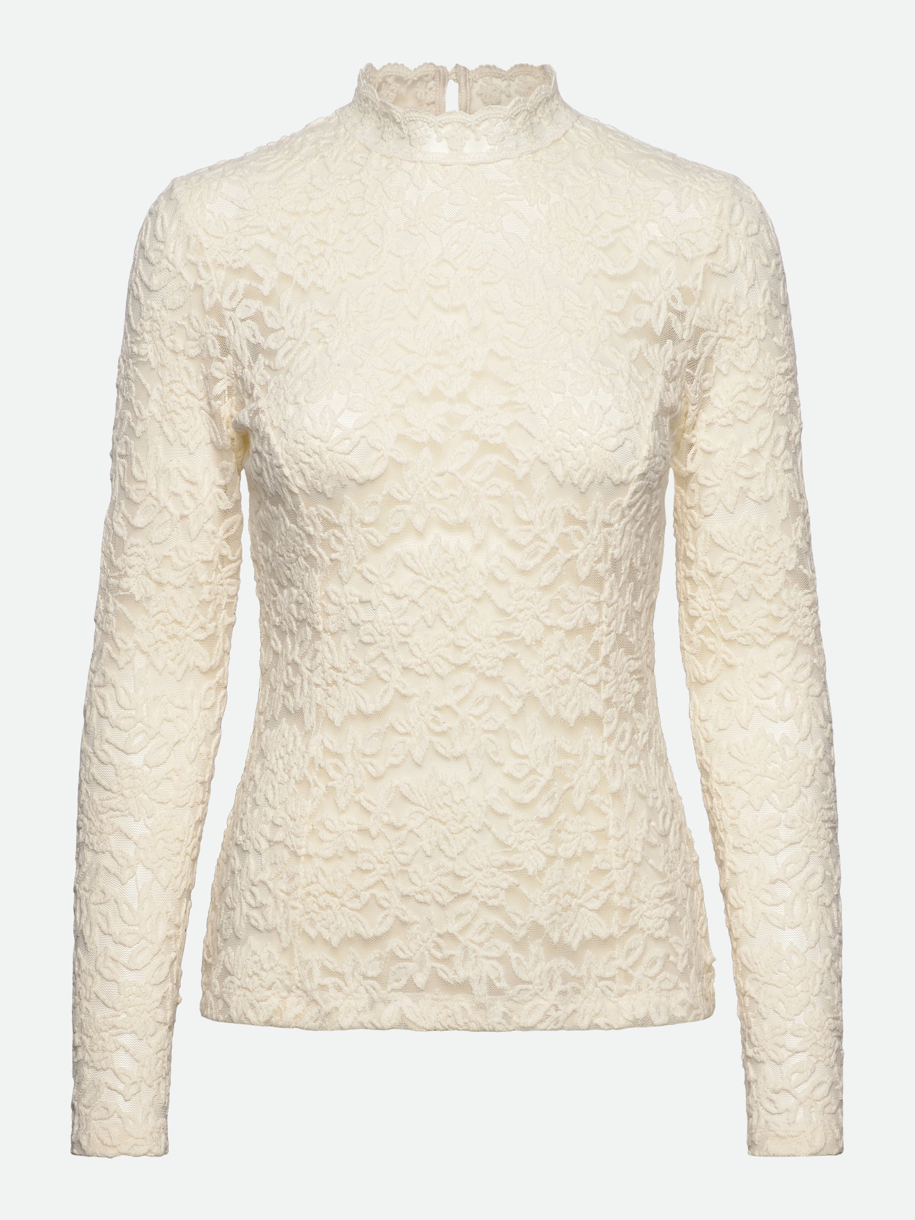 A timeless staple reimagined in delicate floral lace. This sheer long-sleeve top features a high neckline with subtle scalloped edging and a keyhole back detail for a refined finish. Designed to layer effortlessly under tailoring or elevate an evening look, it offers both structure and softness in one beautifully crafted piece.