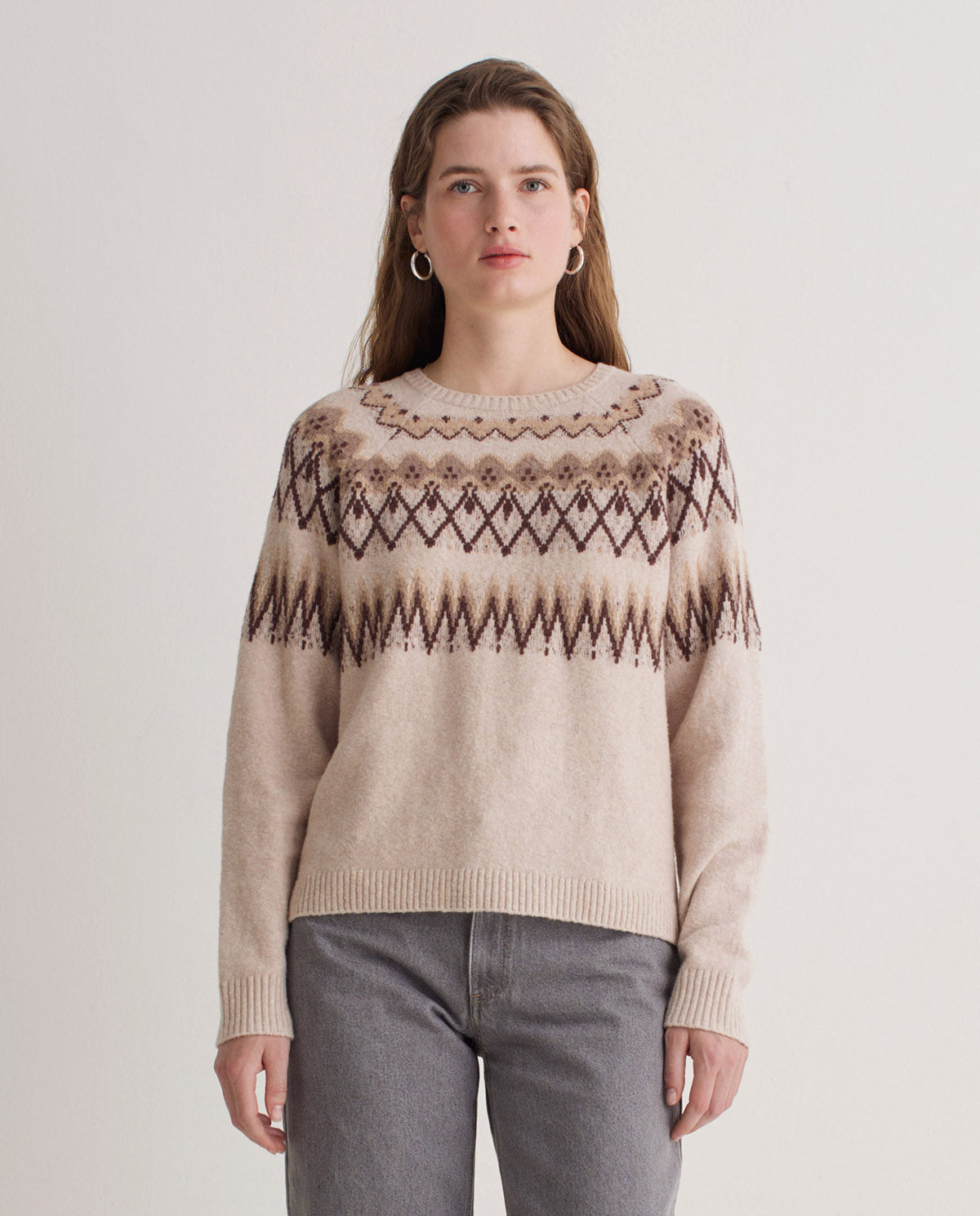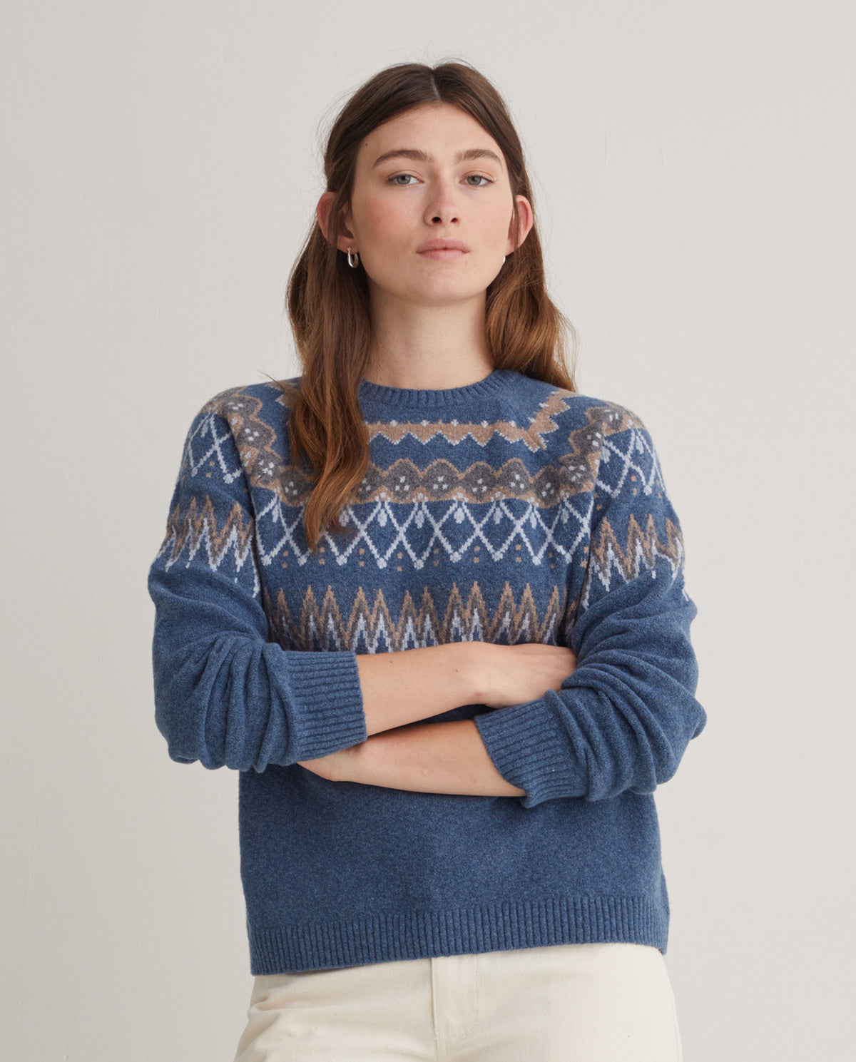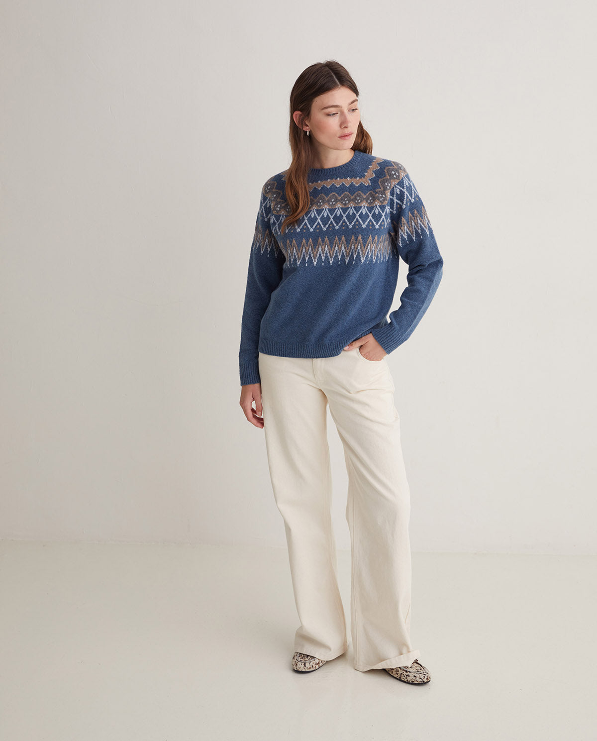 This Fair Isle Knit is a beautifully detailed and cosy piece perfect for the colder seasons. Featuring a timeless Nordic-inspired pattern across the chest and sleeves, it brings a hint of vintage charm to a classic crew neck silhouette. The blend of cotton, wool and stretch ensures a soft, breathable feel with a gentle drape, while the structured knit keeps you warm and comfortable throughout the day.