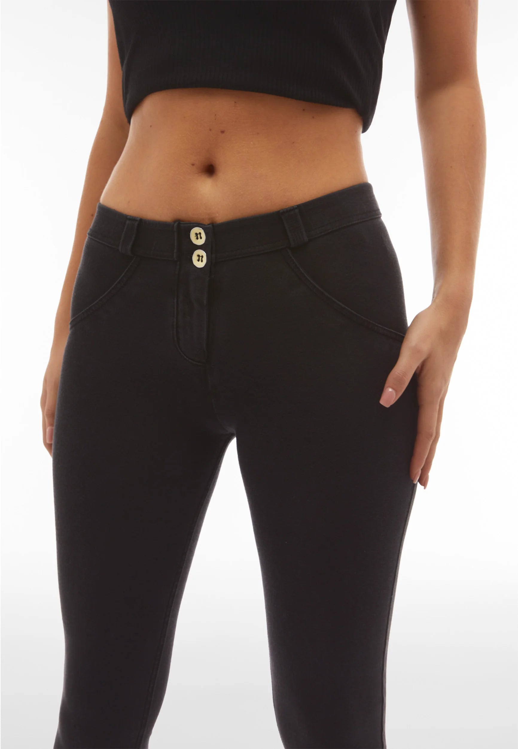 Crafted from a high-quality blend of 84% cotton and 16% elastane, these black denim trousers offer softness with just the right amount of stretch. Featuring Freddy’s patented WR.UP® technology, they provide a flattering shaping and lifting effect, contouring your figure while ensuring all-day comfort. The mid-rise waist and classic full-length design make these jeans versatile and easy to pair with any outfit, perfect for both casual days and evenings out.