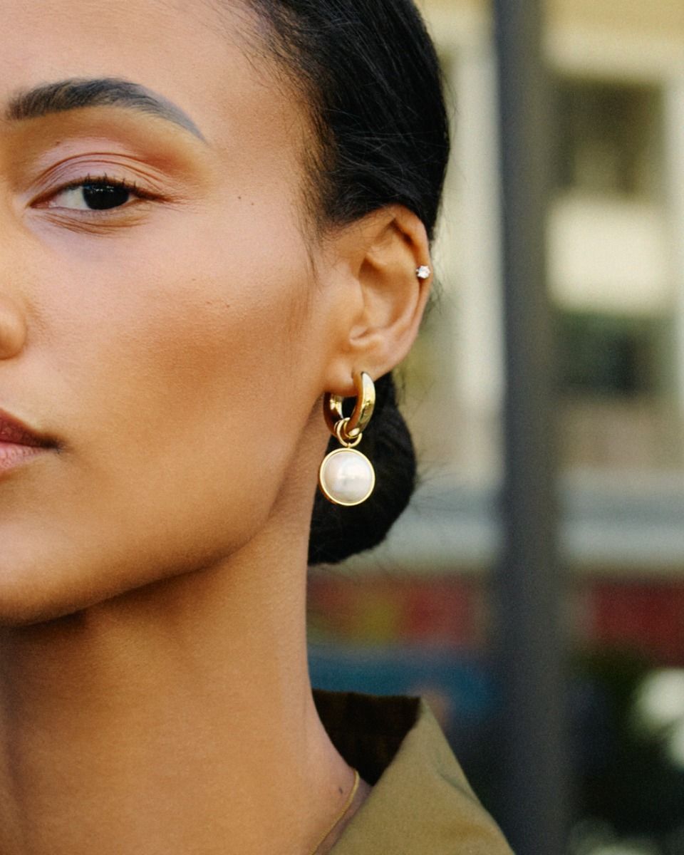 The Gabrielle Hoops L offer a timeless blend of modern design and classic detailing. Crafted in 14K gold plating on stainless steel, these larger hoops feature a luminous mother-of-pearl bead charm suspended from a sleek rail. The charm is removable, allowing you to wear the hoops in two ways, with or without the bead, making them a versatile addition to your jewellery collection.