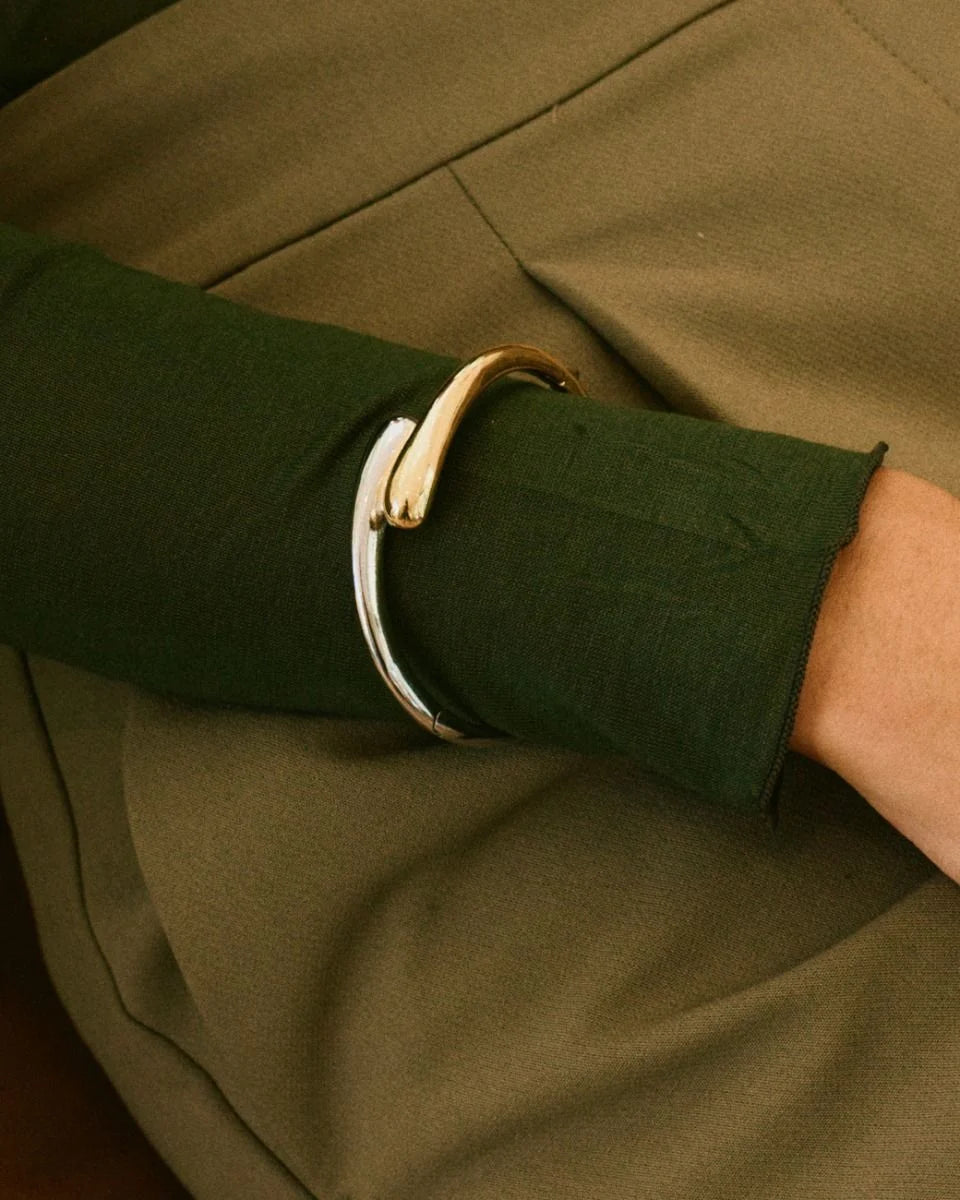 The Harmony Bangle is a timeless piece crafted in stainless steel with a touch of 14K gold plating. Its elegant drop-shaped design blends the metals seamlessly, symbolising balance and unity. Finished with a hidden clasp, this water-resistant bangle is both stylish and practical, a versatile accessory for every occasion.