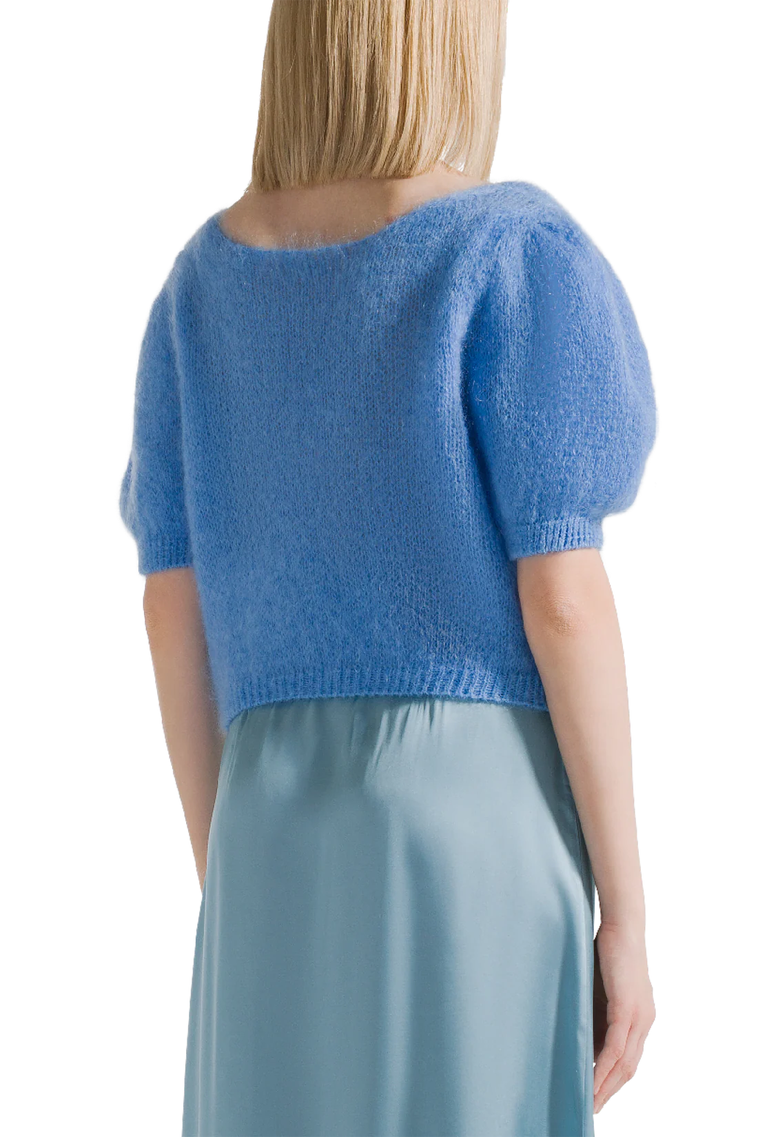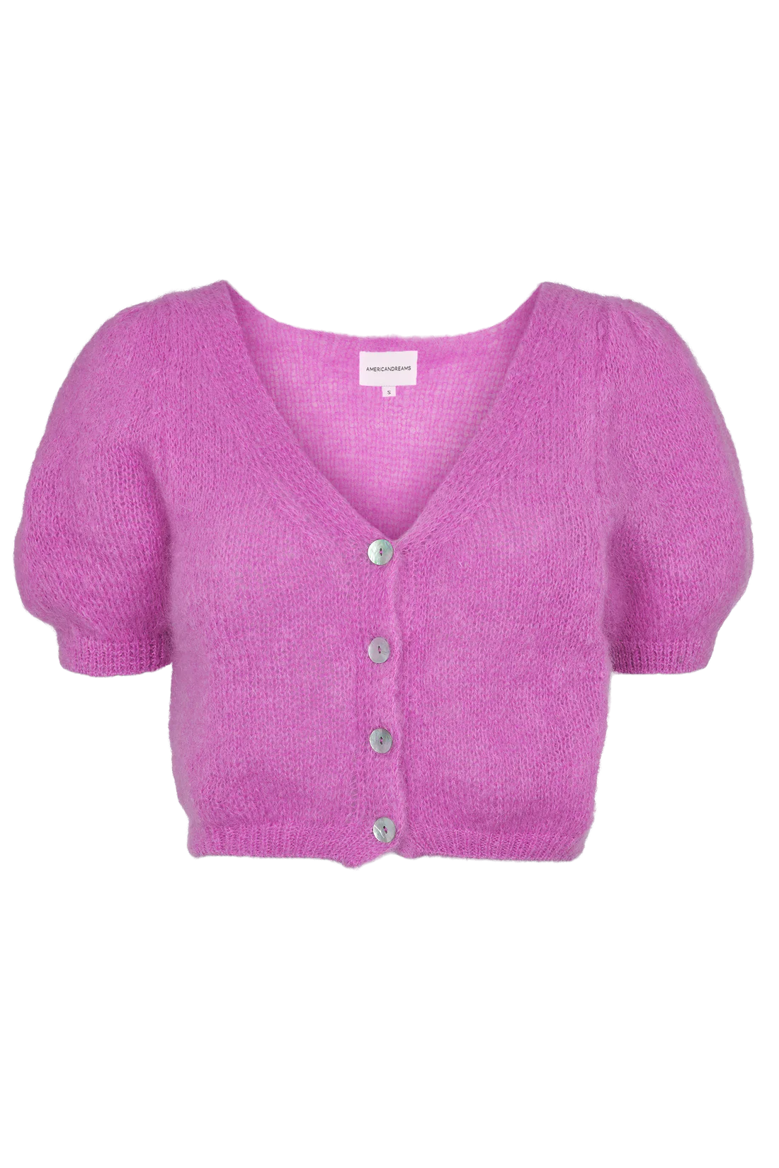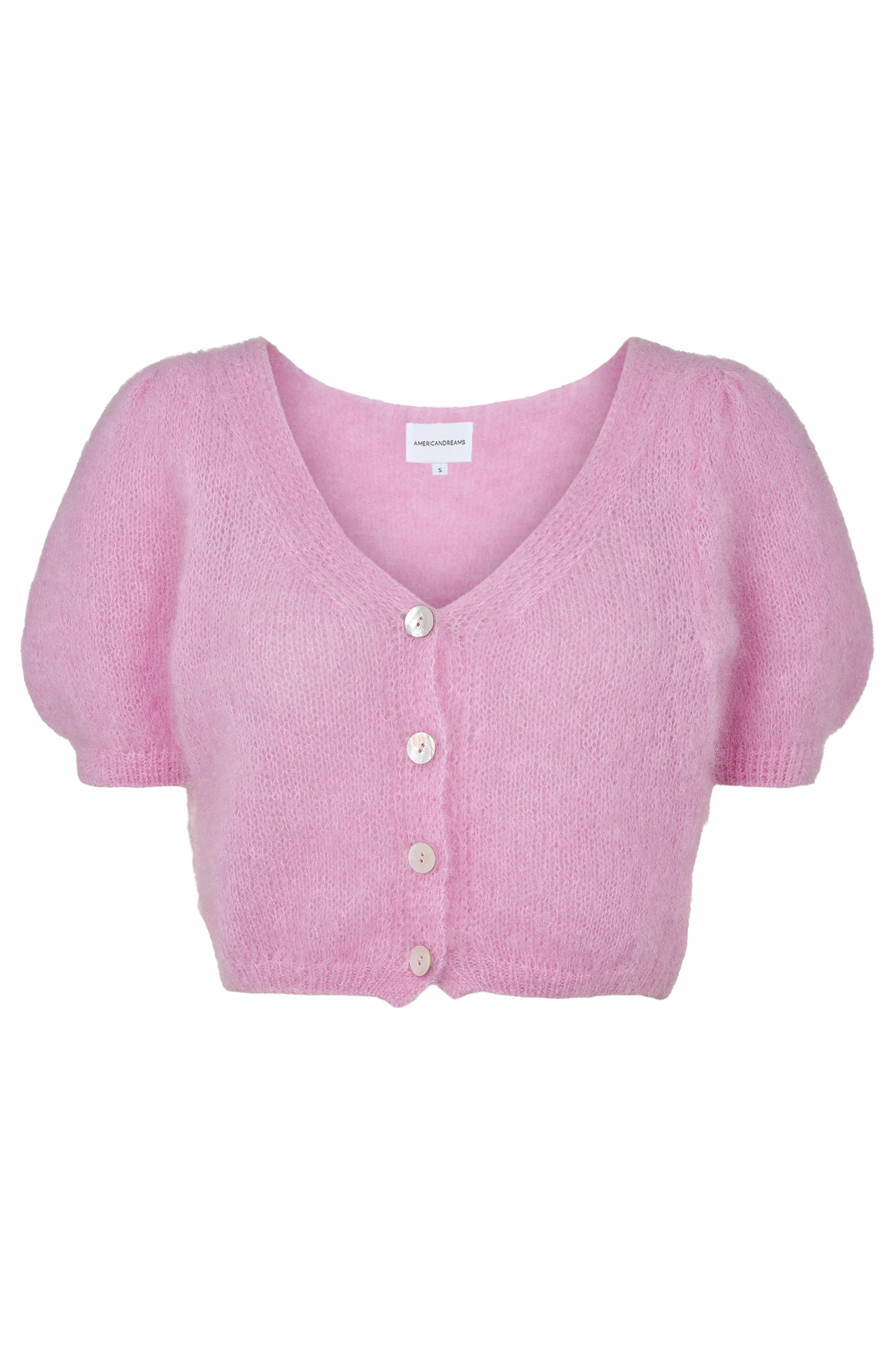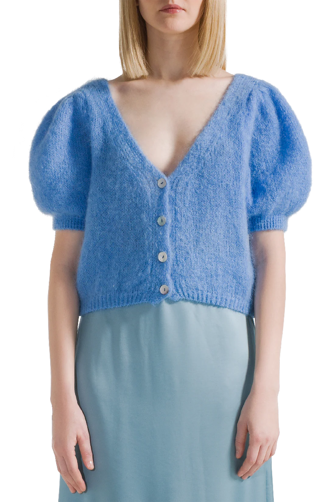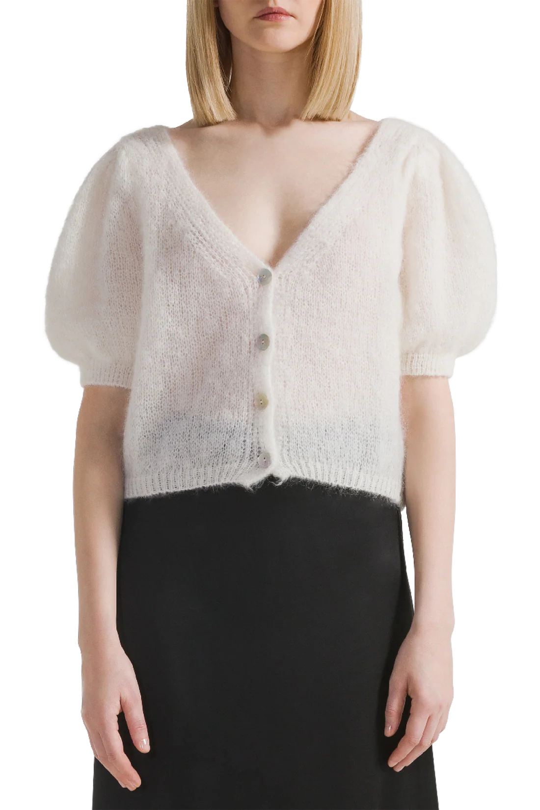 A cropped knitted cardigan featuring a button closure and V-neck that accentuates the delicate lines of the neck and collarbones will add a feminine touch to your daily ensembles. The cardigan is inspired by our signature Cornelia cardigan made in a short sleeve version especially suitable for spring and summer.