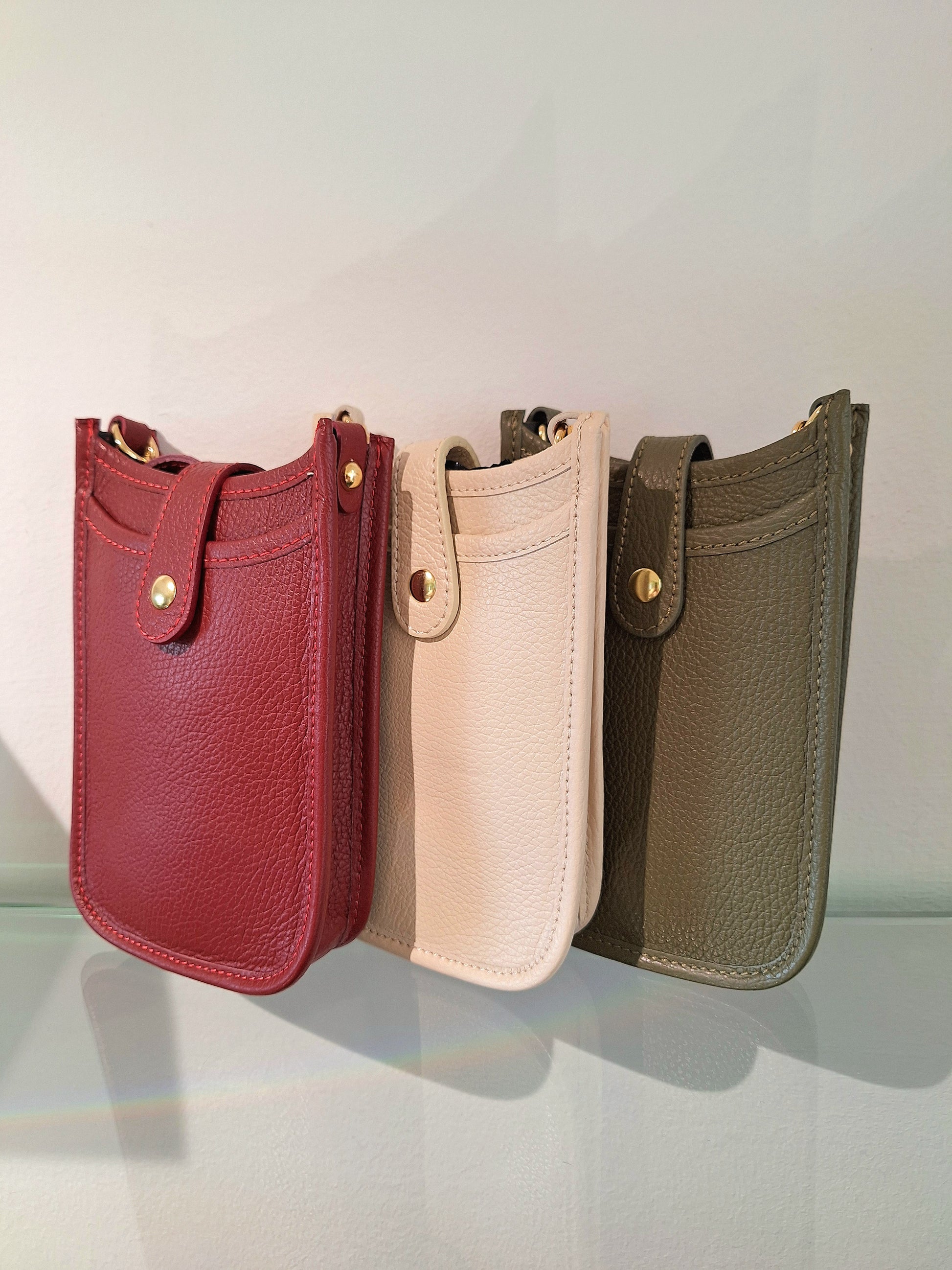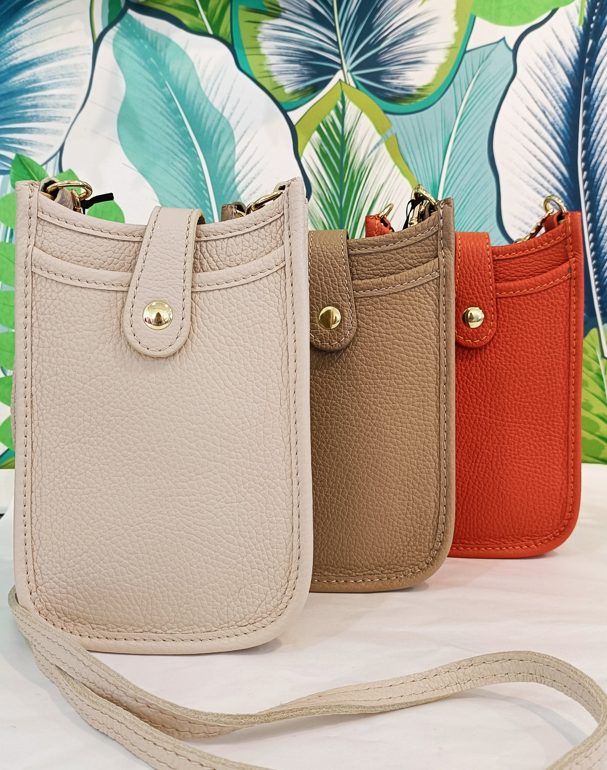 Genuine leather phone bag with two pockets, snap clasp and gold features. Perfect for those on the go!