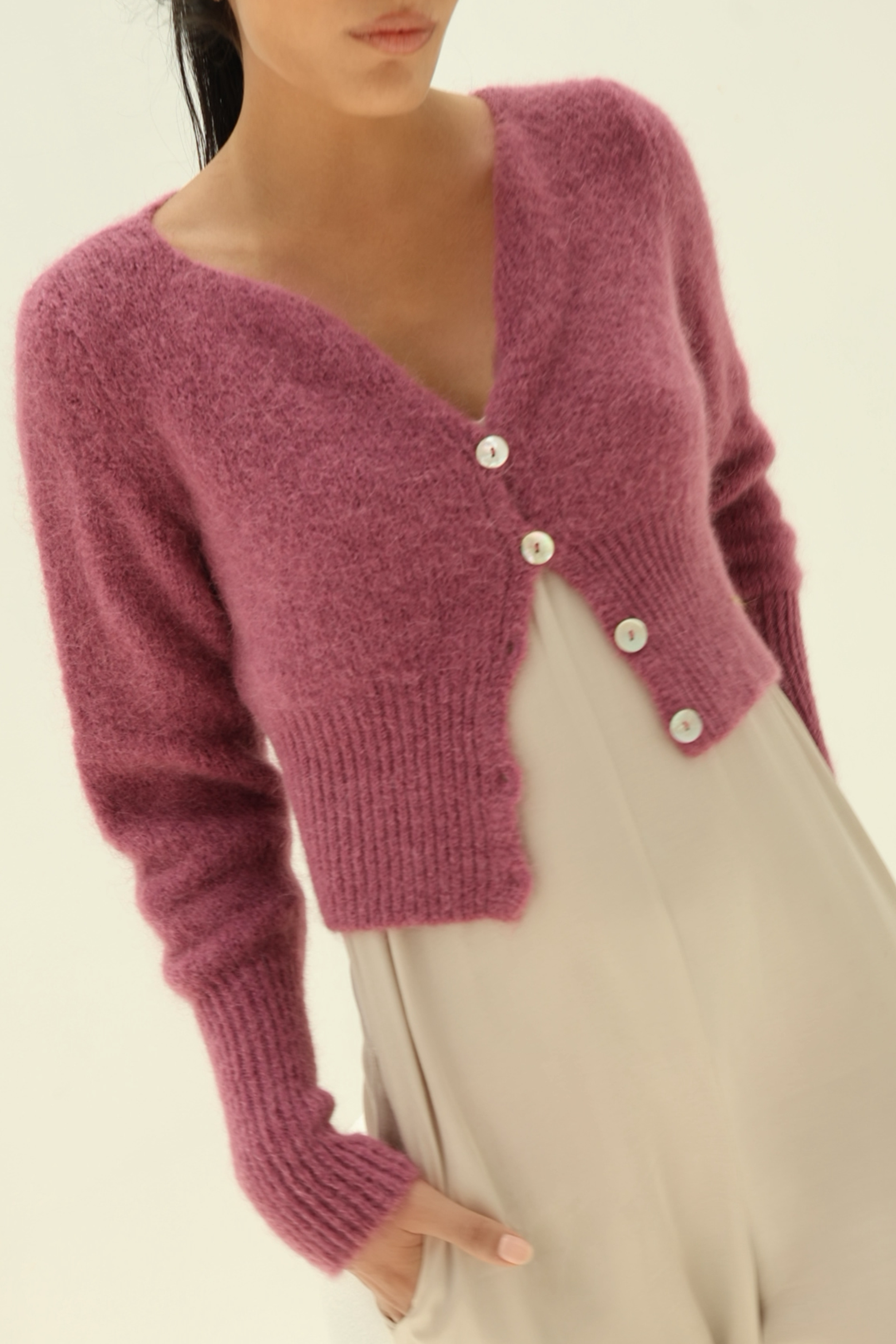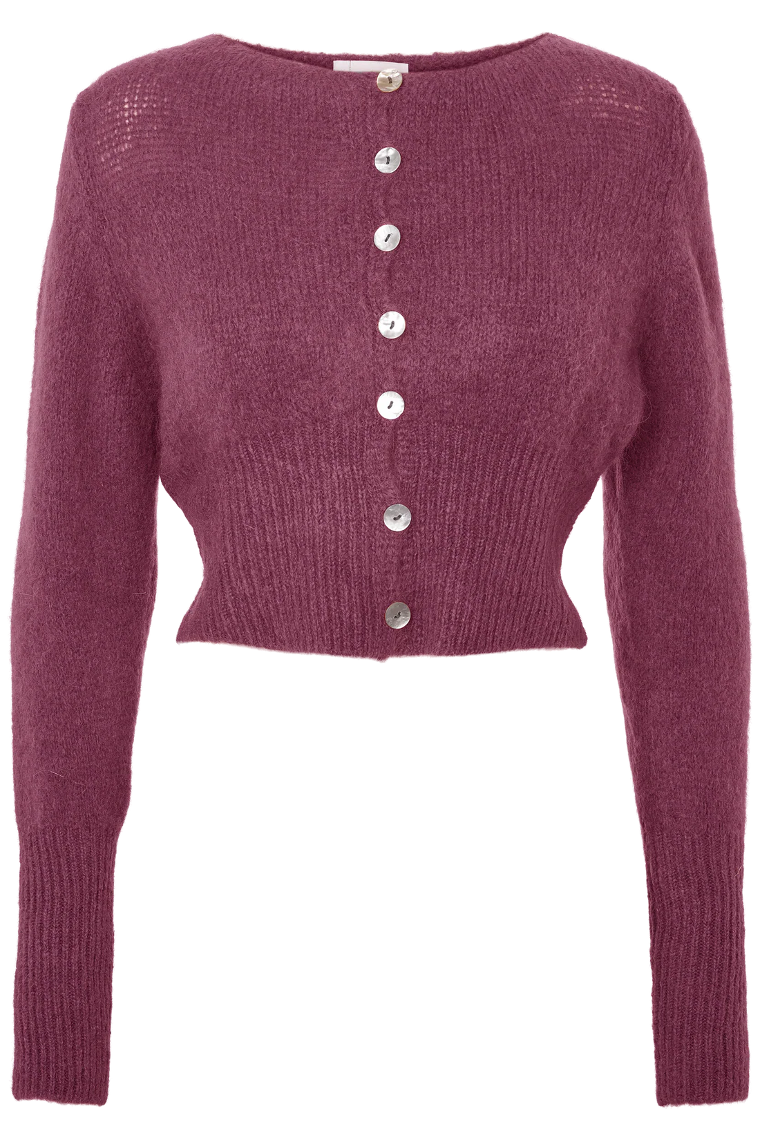 The Matilda Cardigan is a cropped, form-fitting knit crafted from a soft alpaca blend for cosy everyday wear. Designed with a round neckline, ribbed waistband, and full button-up front, this cardigan offers a snug silhouette that pairs effortlessly with high-waisted denim or layered over dresses. Finished in a rich Bordeaux tone, it brings warmth and texture to seasonal dressing.