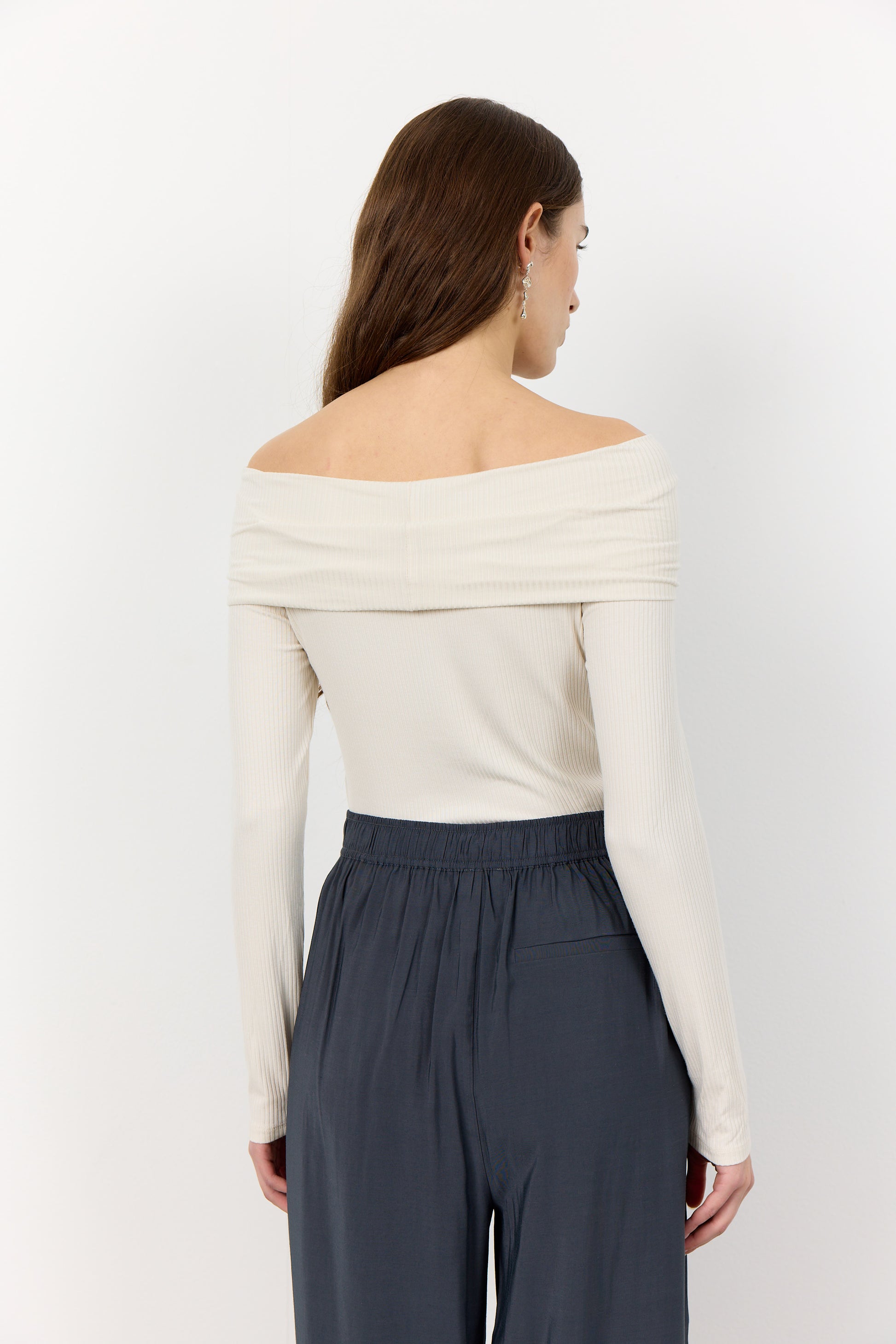 A stylish Blouse made with a comfortable blend of 95% ECOVERO Viscose, 5% Elastane. This top features an off-the-shoulder neckline, long sleeves, and a ribbed texture throughout for a modern look. Pair it with tailored trousers or a flared skirt for a smart, contemporary appearance.