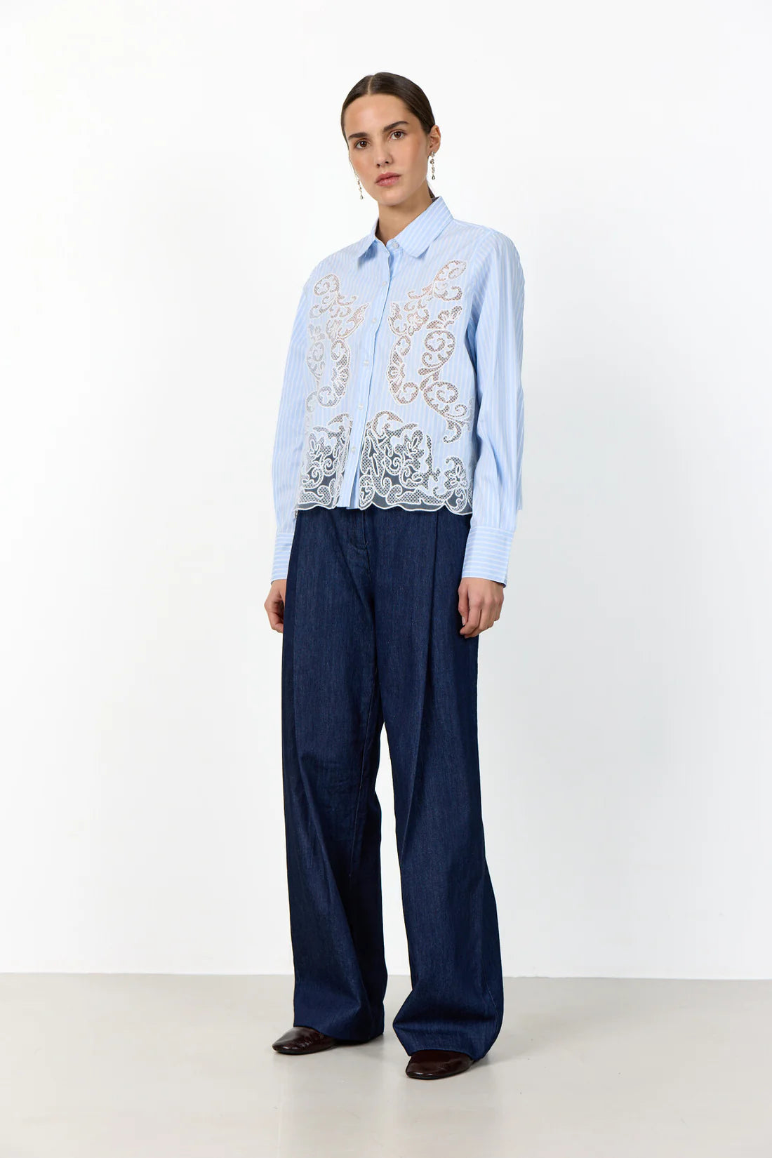LR-PIPPIN 1 is a unique and elegant shirt designed to bring a refined twist to classic tailoring. Crafted from a comfortable cotton blend with added stretch, it features a timeless collar and button-front closure, finished with a delicate lace overlay and subtle pinstripe print for a sophisticated, feminine edge. Perfect styled with tailored trousers for a polished look or paired with a sleek skirt for effortless occasion dressing.