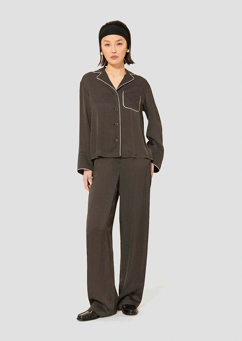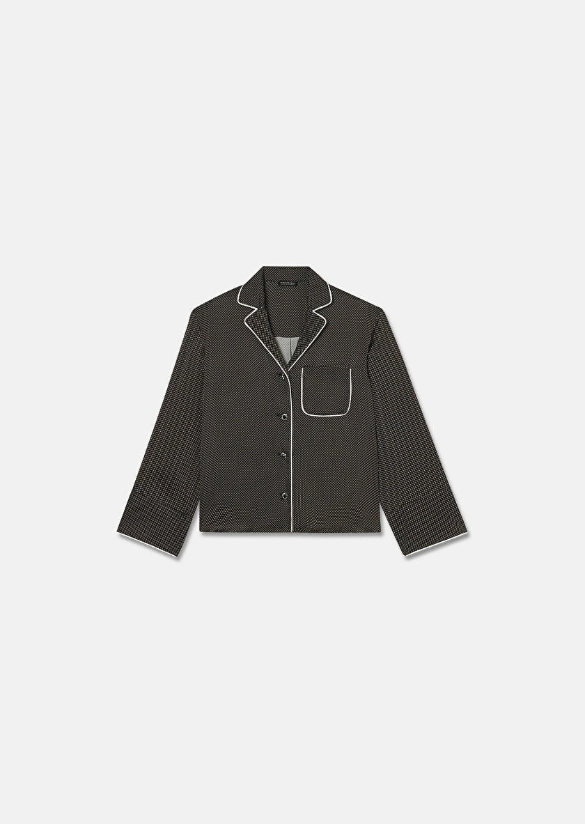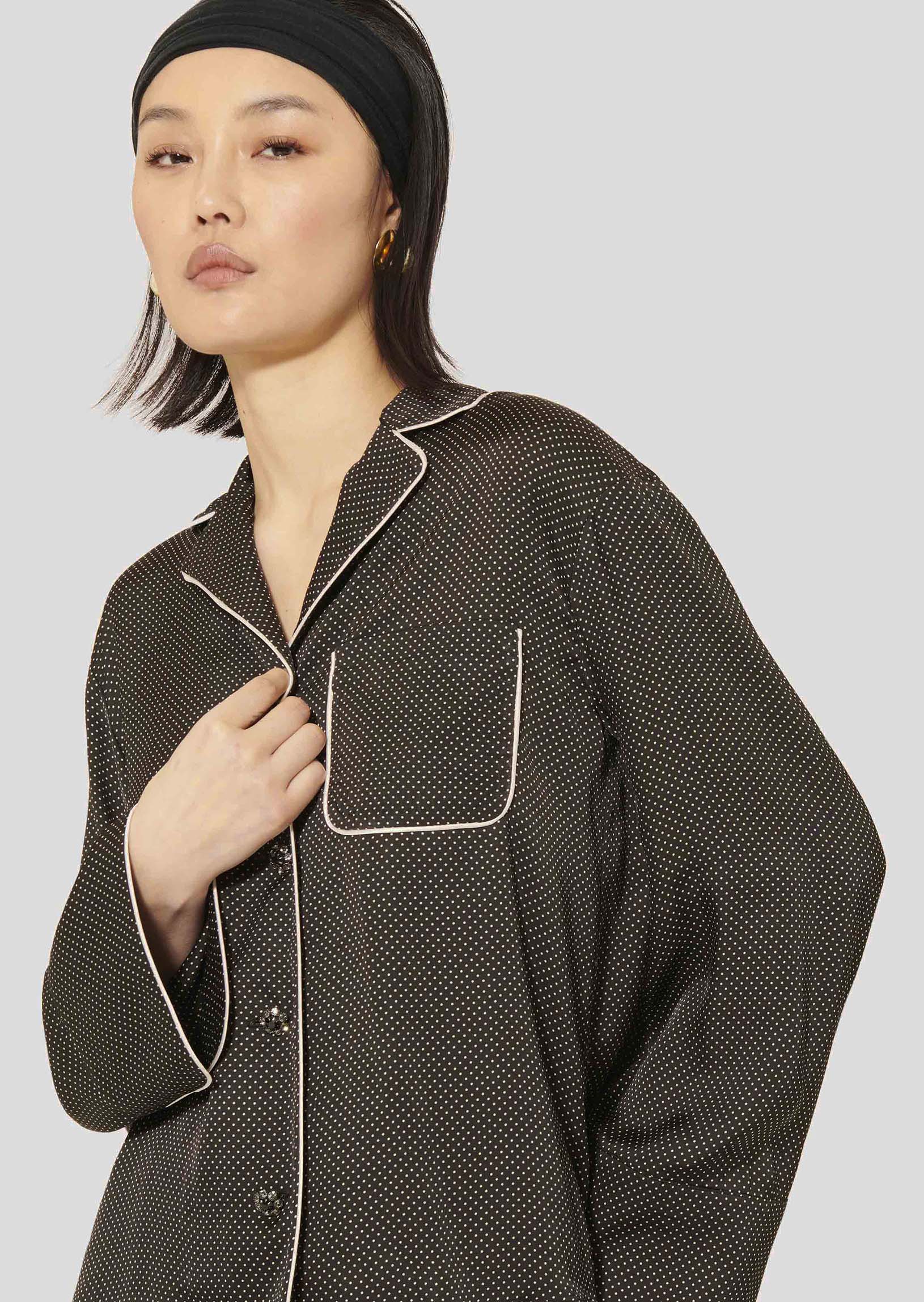 This black polka-dot print shirt has a straight, flowing cut. It features a shirt collar, long flared sleeves at the cuffs and a patch pocket at the chest. It is fully outlined with ecru piping and closes at the front with pretty black and silver jewel buttons.