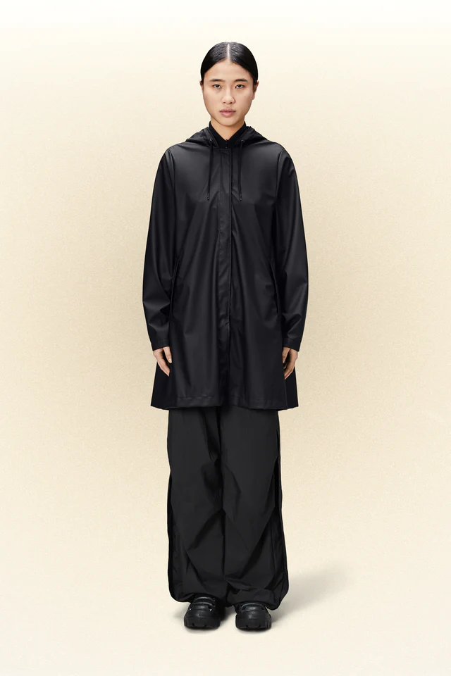 A-line Jacket is a women’s raincoat characterized by its A-shaped silhouette that gradually builds in volume from chest to hem. A-line Jacket features a drawstring hood with built-in cap, two side pockets and snap adjustable cuffs. The jacket is completed with hidden snap buttons and a front placket.