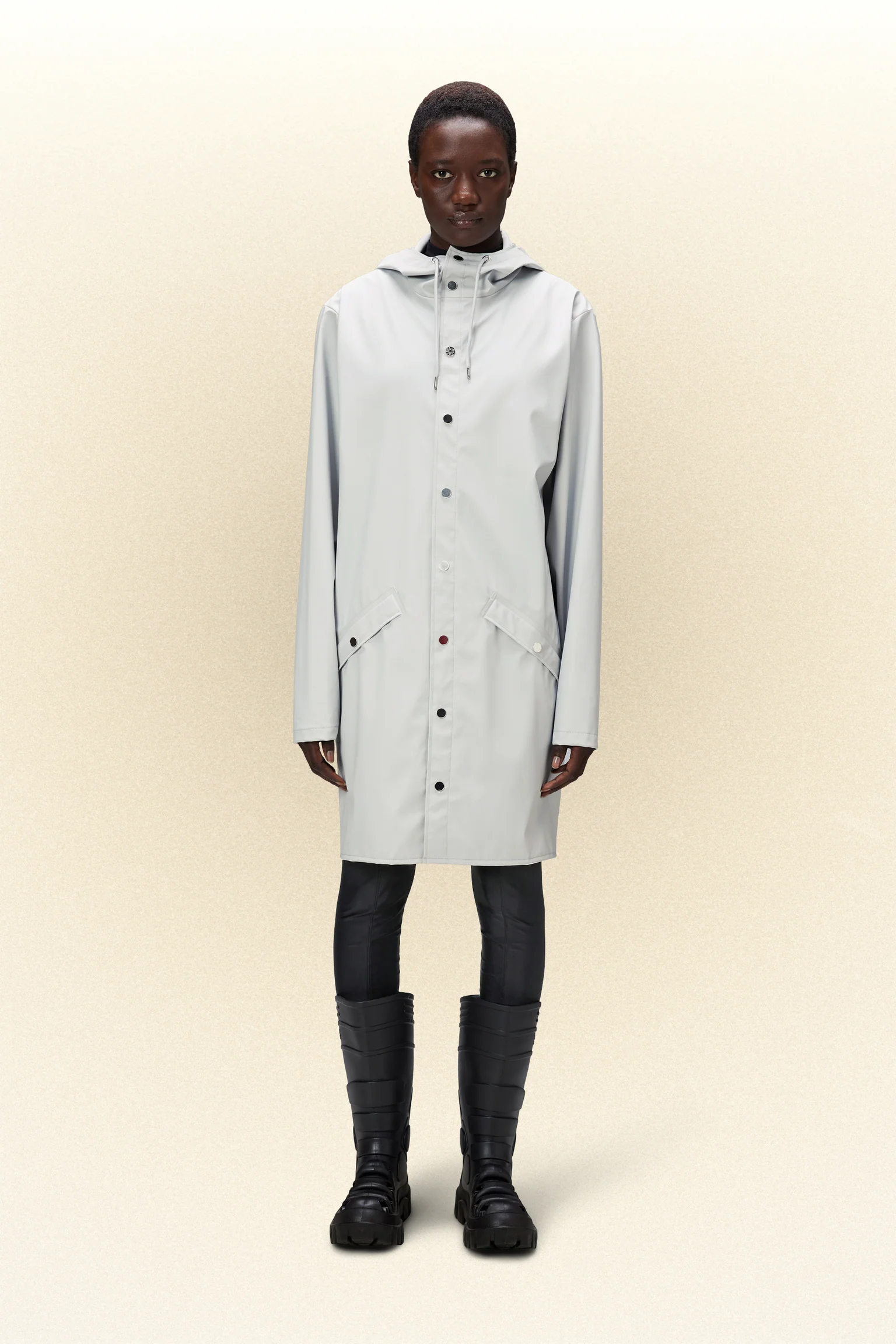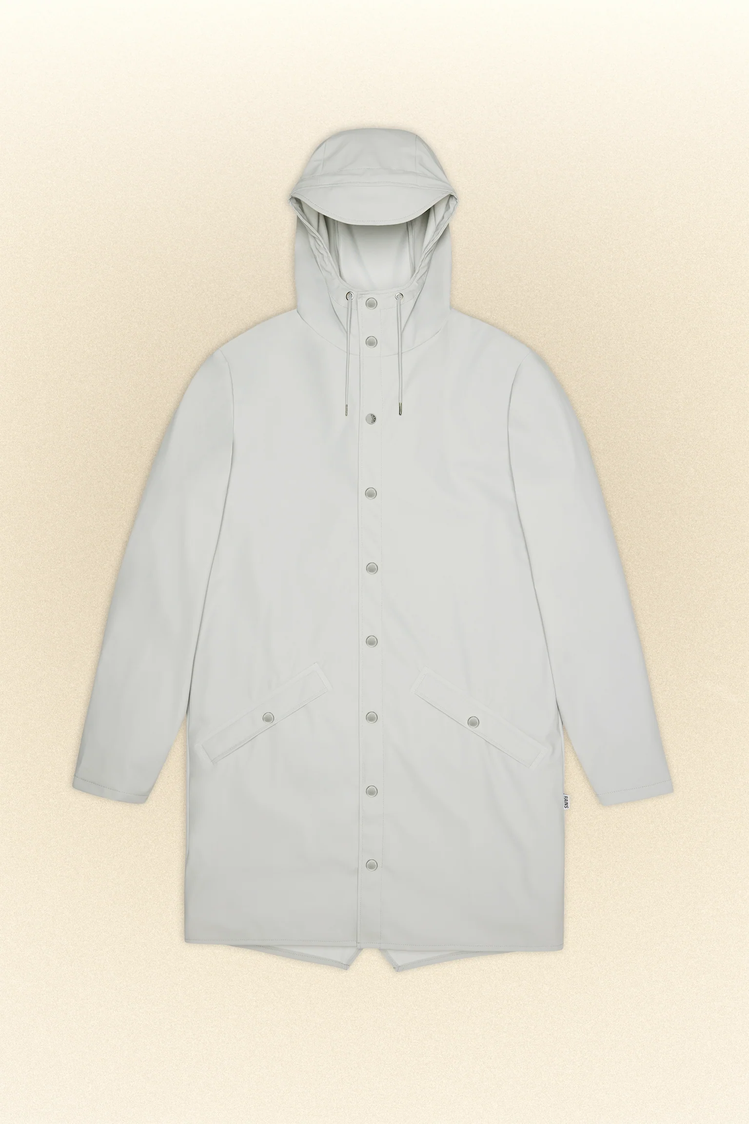 Long Jacket is a longer version of Rain’s classic design, Jacket. This ever-contemporary unisex rain jacket delivers high functionality in a minimal silhouette. Features include double welded slanting flap pockets, adjustable cuffs and a fishtail hem. The look is finished with snap fastenings, under-arm eyelets, and a back yoke with concealed vents.