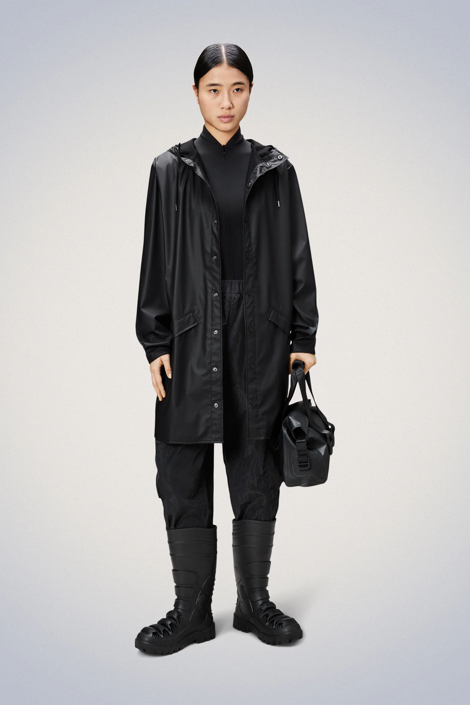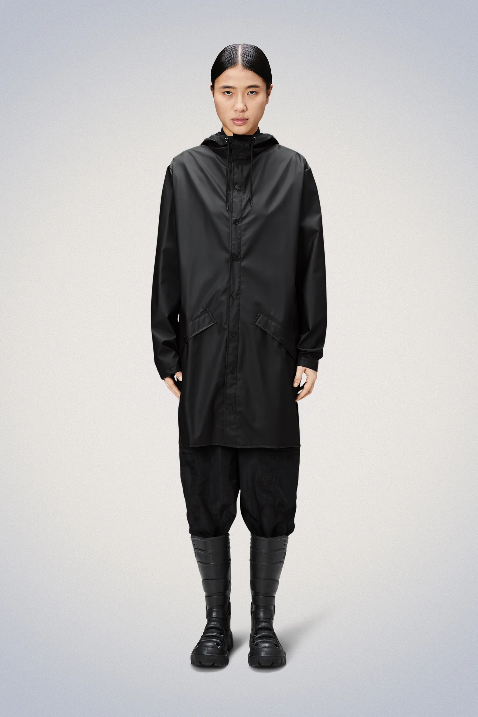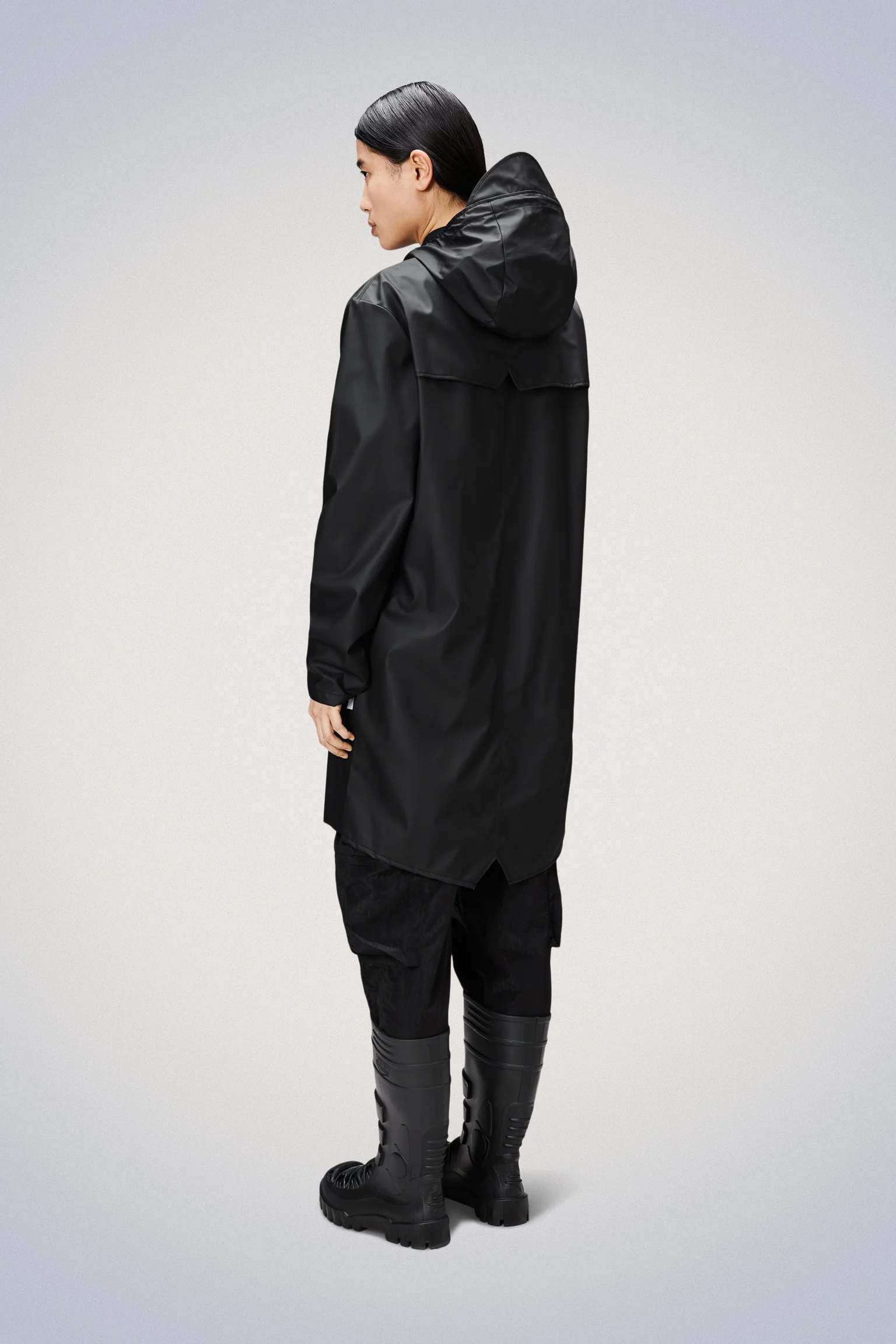 Long Jacket is a longer version of Rain’s classic design Jacket. This ever-contemporary unisex rain jacket delivers high functionality in a minimal silhouette. Features include double welded slanting flap pockets, adjustable cuffs and a fishtail hem. The look is finished with snap fastenings, under-arm eyelets, and a back yoke with concealed vents.