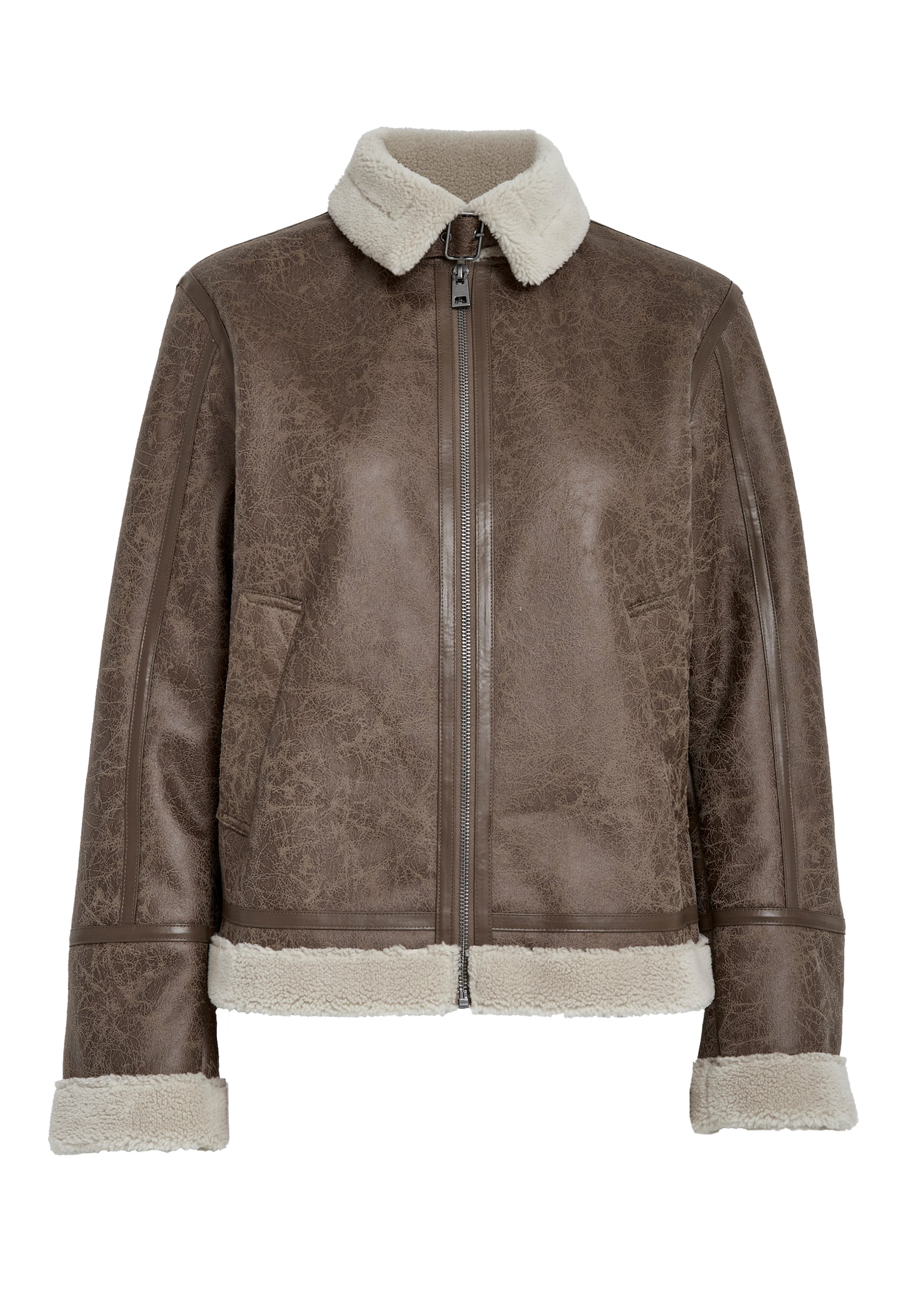 The Roxanna Jacket is a standout piece inspired by vintage aviator styles, updated for the modern wardrobe. Crafted in a cracked leather-look finish, this fully lined faux shearling jacket delivers both warmth and edge. It features a soft, fluffy interior that peeks through at the collar, cuffs, and hem, while a structured outer shell offers a sleek contrast.
