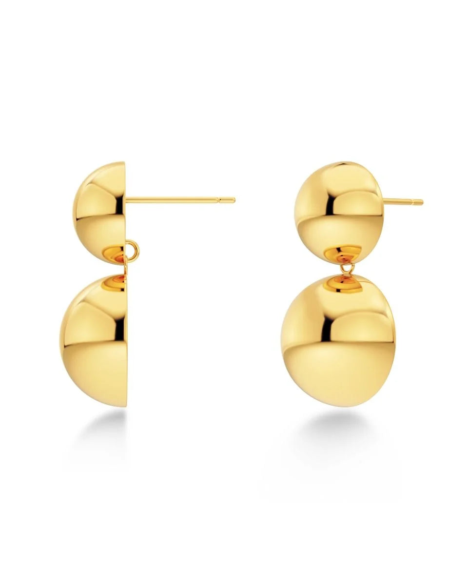 The Sphere Earrings S are a refined take on the bold, sculptural design of the Sphere line. Crafted with 14K gold plating on stainless steel, the smaller silhouette features a floating hemisphere suspended beneath a smaller globe by a hidden pendant, creating a timeless and elegant rhythm. Their versatile size makes them perfect for everyday wear while still delivering a statement finish.