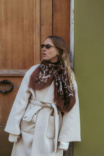 Featuring a classic bandana pattern reimagined in deep burgundy and rich chocolate tones, this piece adds a striking yet understated accent to your look. Drape it loosely around the neck for casual layering, tie it with structure for a polished finish, or style it as a headscarf for a touch of Parisian chic.