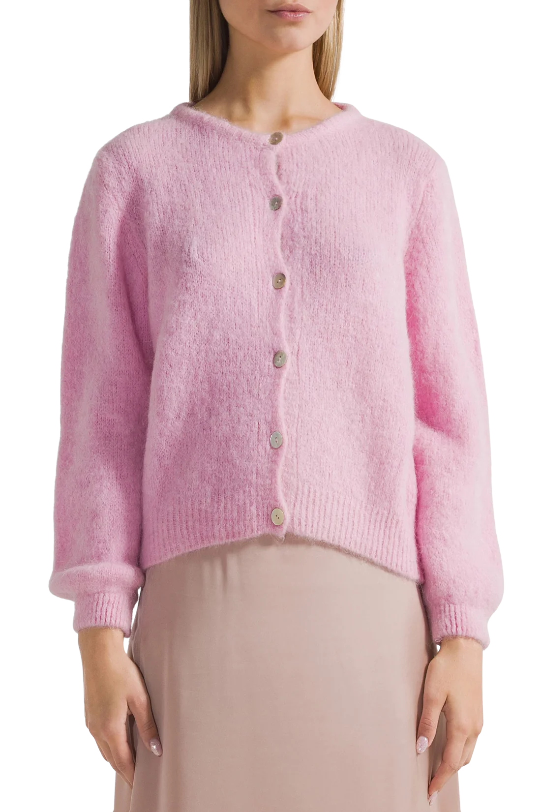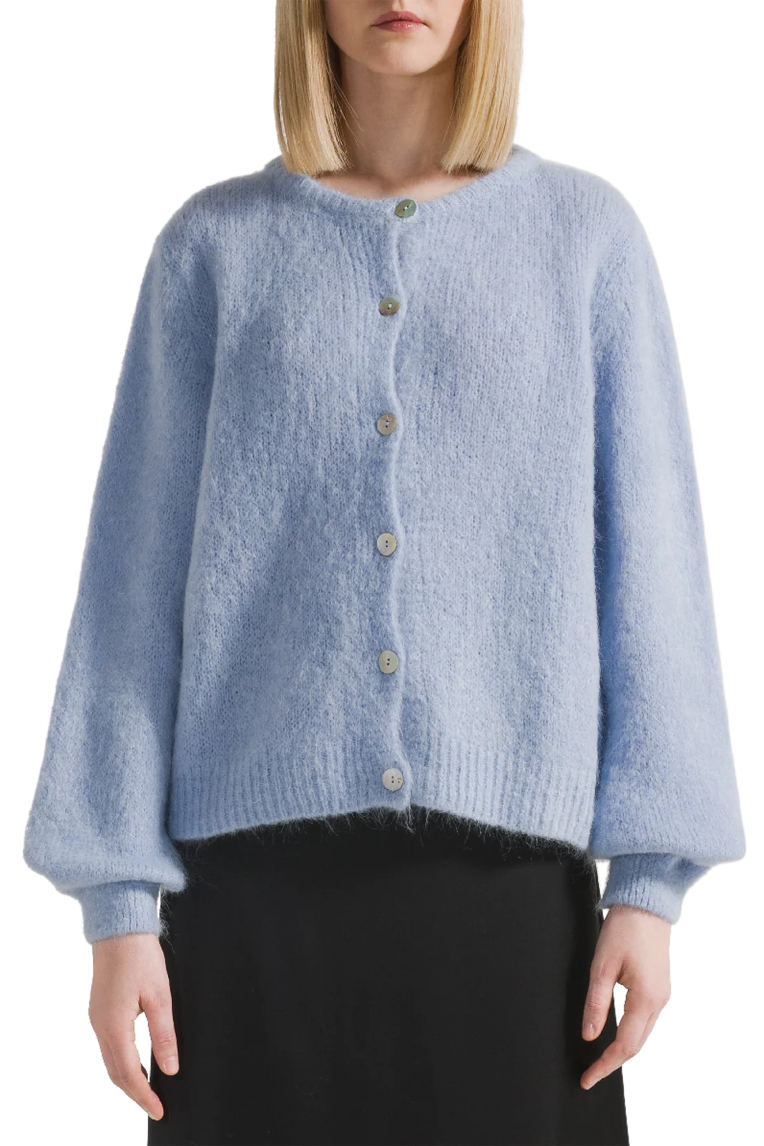 An alpaca wool cardigan provides superior thermoregulation and durability compared to sheep wool. The dense, fluffy knitwear is exceptionally soft, featuring buttons and an elastic band at the hem and cuffs. The Susan cardigan will add a cozy and serene touch to your outfit.
