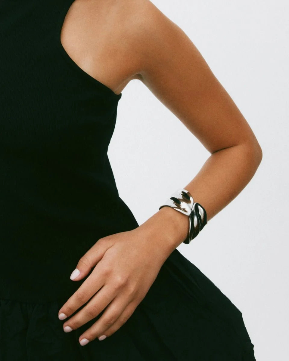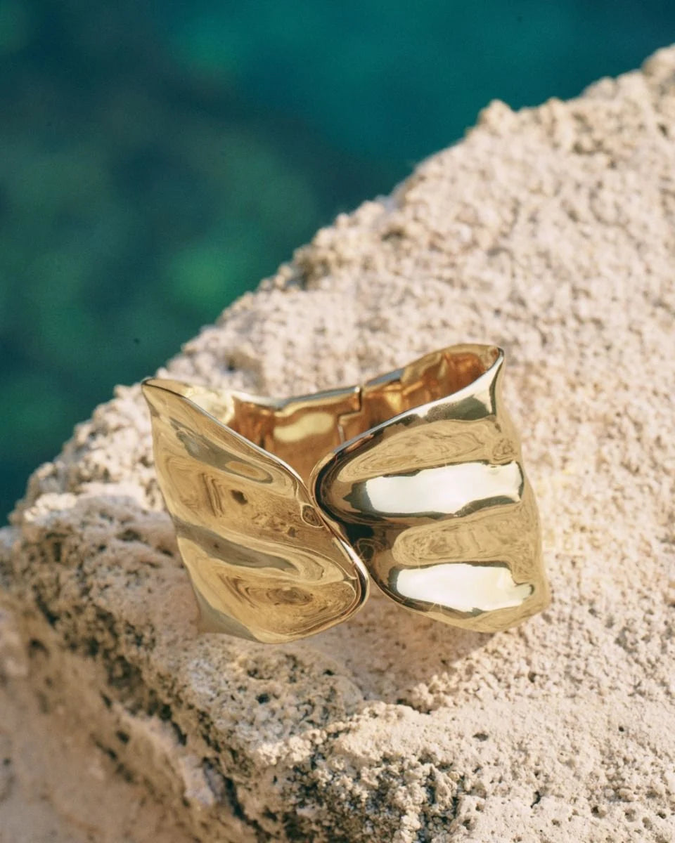 Tidal Bangle is a bold statement piece inspired by the natural rhythm of ocean waves. With its oversized silhouette and polished finish, it captures the fluidity of movement while showcasing expert craftsmanship. Designed with a hidden thread for added comfort, this sculptural bangle is striking whether styled over a sleeve or worn directly against sun-kissed skin.